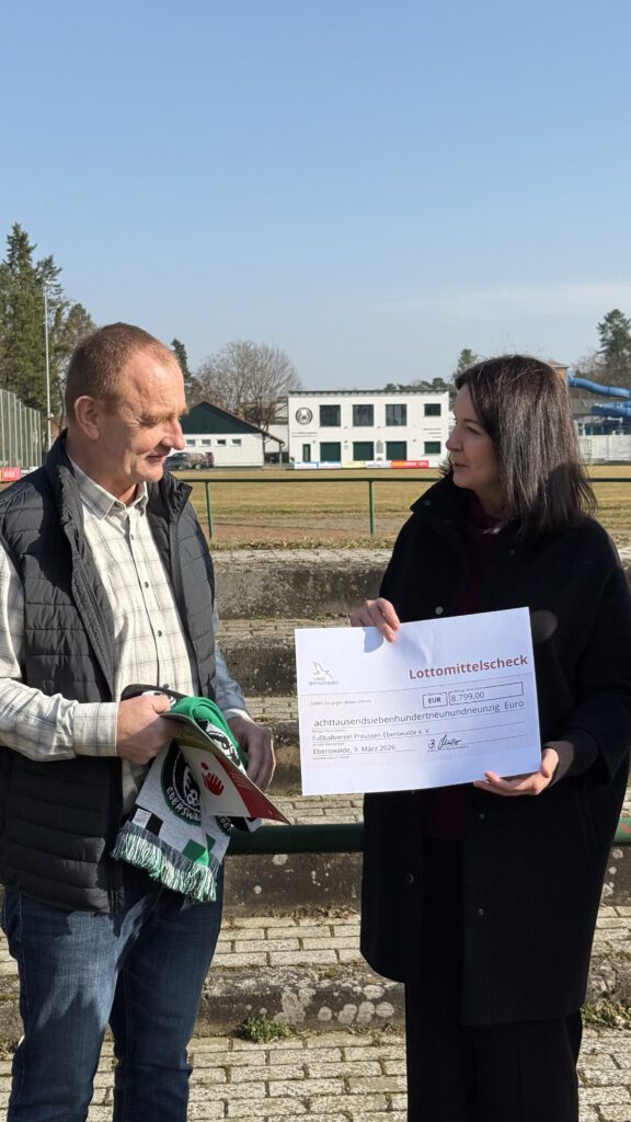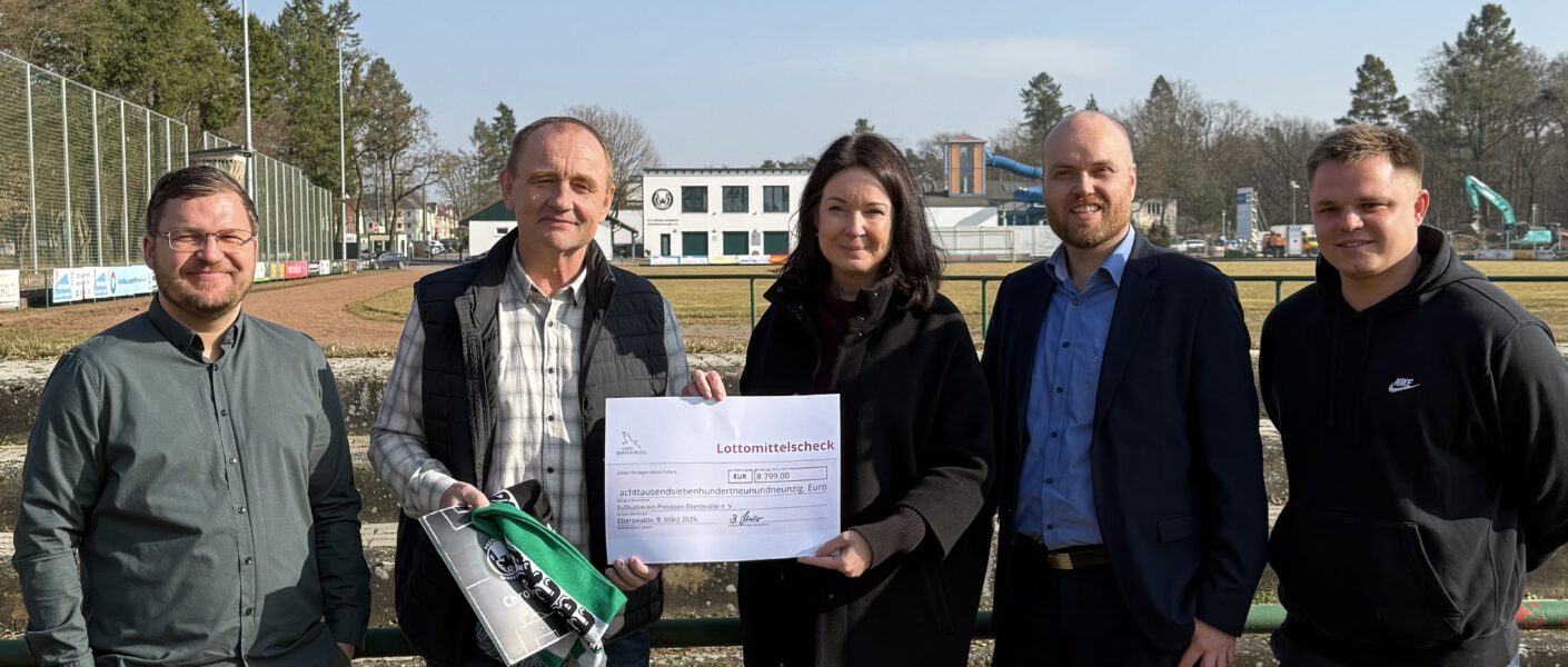 Der FV Preussen Eberswalde durfte sich heute über besonderen Besuch freuen: Brandenburgs Ministerin für Gesundheit und Soziales, Britta Müller, war persönlich vor Ort, um unserem Verein einen Fördermittel Scheck zur Unterstützung neuer Sitzgelegenheiten am B-Platz zu überreichen.